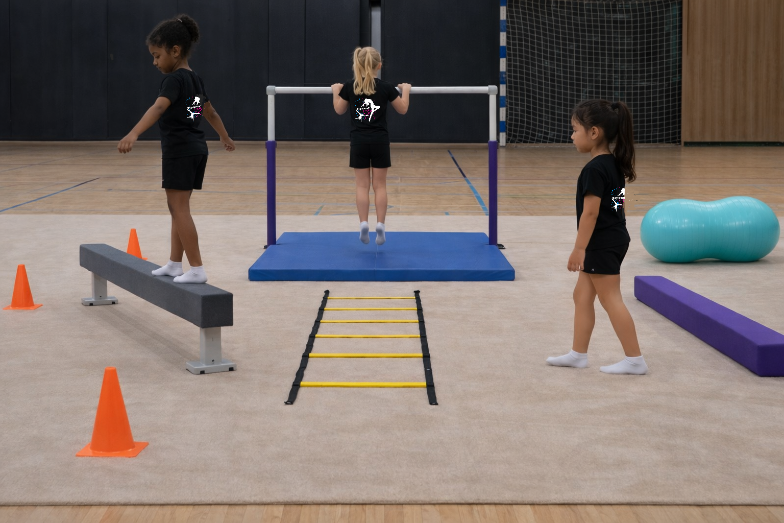 Apprentissage des mouvements de base et premiers enchaînement sur les différents agrès (sol, poutre, barres, saut...).